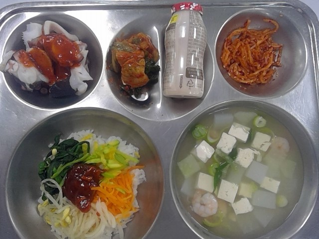 2월4일 비빔밥 두부곤약맑은국 액상요구르트 문어숙회(자율) 배추김치 우유