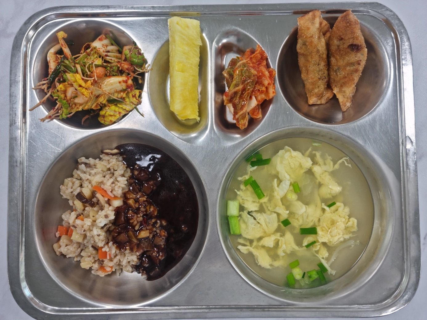 중화식볶음밥&자장소스(밀양) (5.6.13.16)계란실파국(밀양) (1.5.6)봄나물겉절이(밀양) (5.6.13)배추김치(밀양) (9)교자군만두(밀양) (1.5.6.10.13.15.16.18)골드파인애플(밀양) 우유(우유급식) (2)