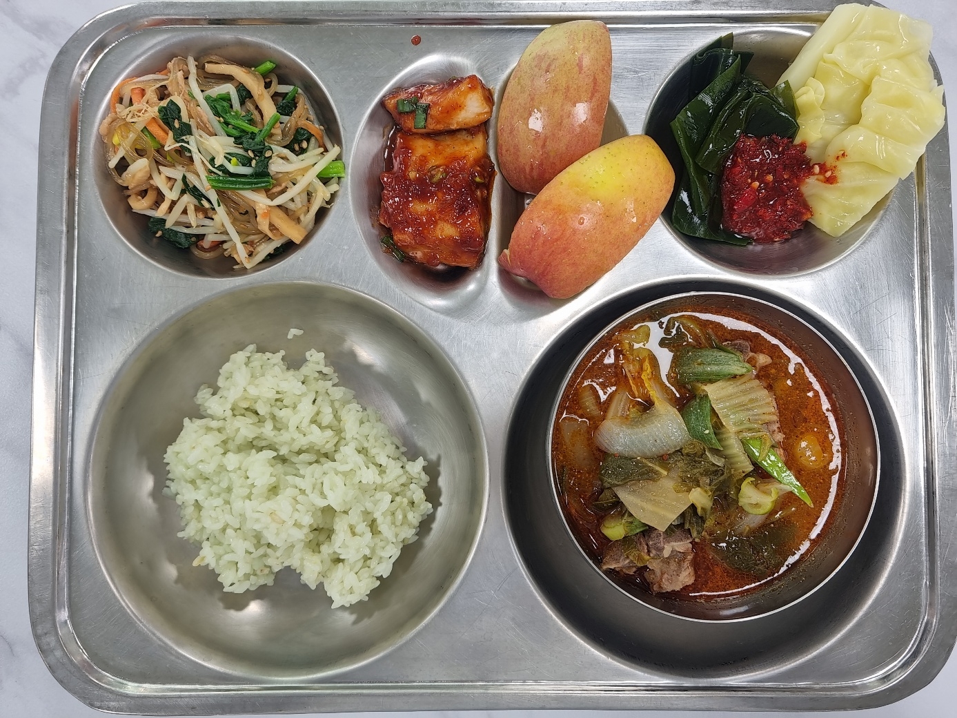 클로렐라쌀밥(밀양) 돼지뼈감자탕(밀양) (5.6.9.10)콩나물잡채(밀양) (1.5.6.10.13)임연수고추장양념구(밀양) (5.6.13)배추김치(밀양) (9)양배추&다시마쌈(밀양)(자율) (5.6.18)사과(밀양) 우유(우유급식) (2)