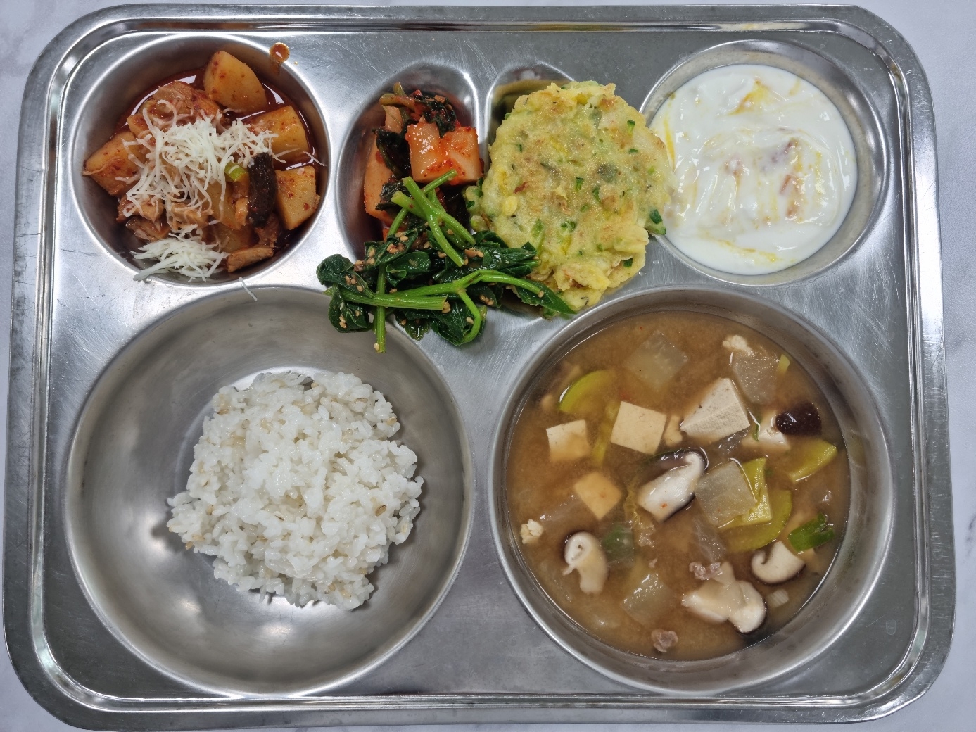 현미밥(밀양) 청국장찌개(밀양) (5.6.9.16)방풍나물된장무침(밀양)(자율) (5.6)닭갈비/눈꽃치즈(밀양) (2.5.6.12.13.15.16.18)애호박새우살전(밀양) (1.5.6.9.13)알타리김치(밀양) (9)요거트(망고잼)(밀양) (2.13)우유(우유급식) (2)