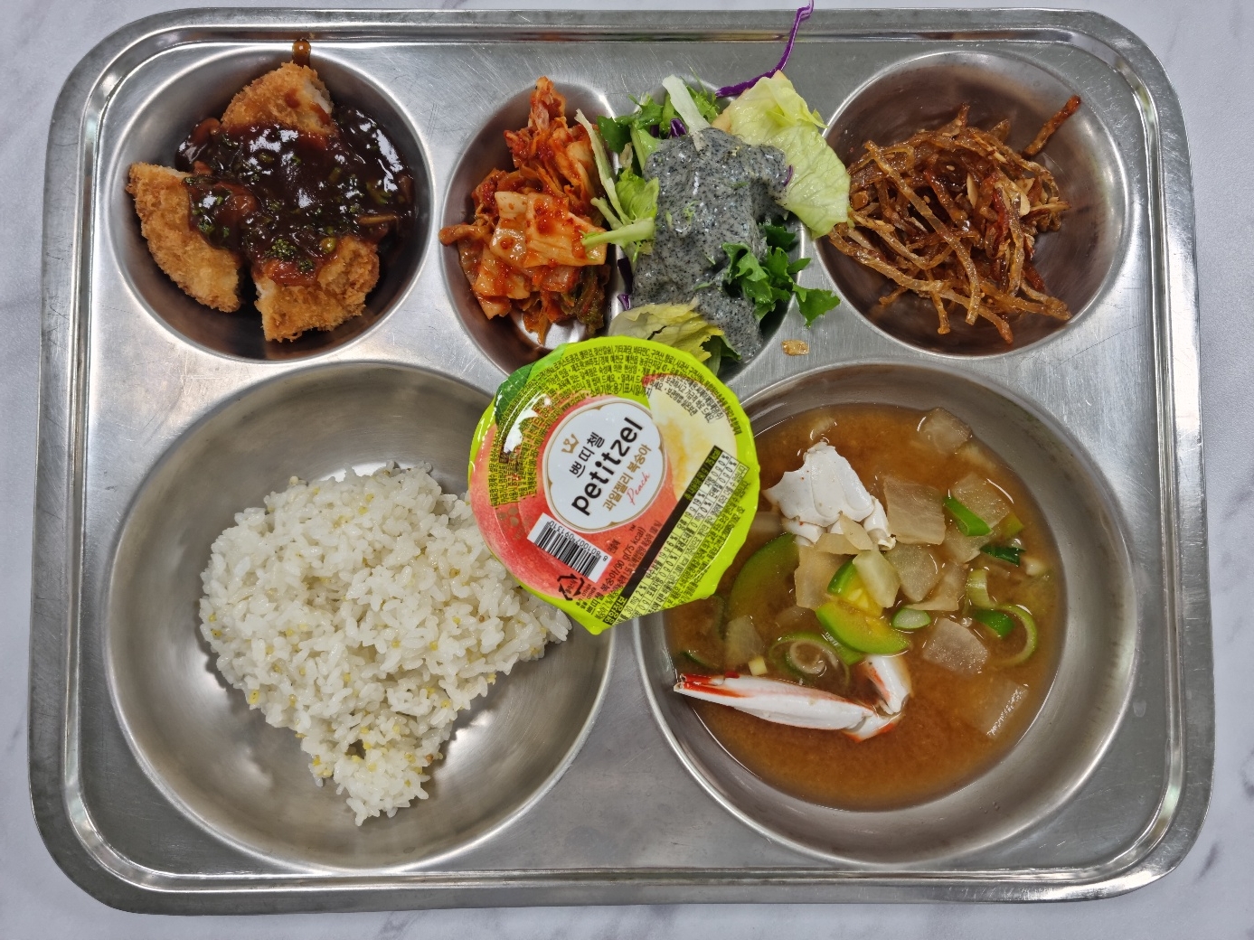 기장밥(밀양) 꽃게탕(밀양) (5.6.8)쥐포채아몬드조림(밀양) (5.6.13)흑임자양상추샐러드(밀양)(자율) (1.5.13)등심돈가스/소스(밀양) (1.2.5.6.10.12.13.16.18)배추김치(밀양) (9)복숭아푸딩(밀양) (11)우유(우유급식) (2)