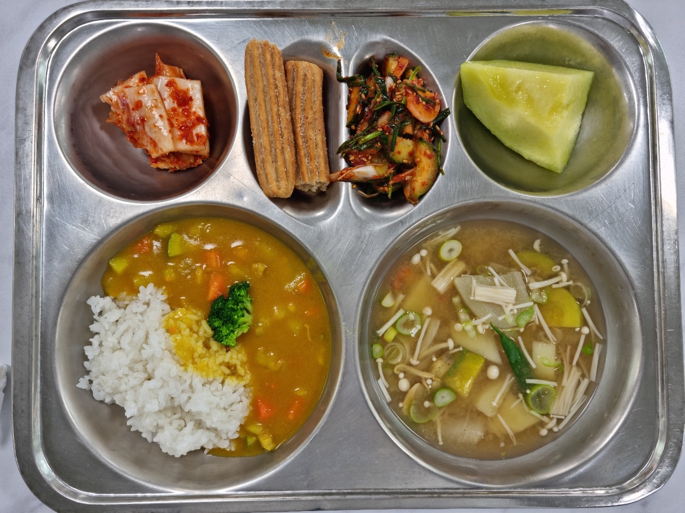 카레라이스(밀양) (2.5.6.10.12.13.16.18)팽이버섯된장국(밀양) (5.6.18)오이달래무침(밀양) (5.6.13)배추김치(밀양) (9)멜론(밀양) 츄러스(밀양) (1.2.5.6)우유(우유급식) (2)