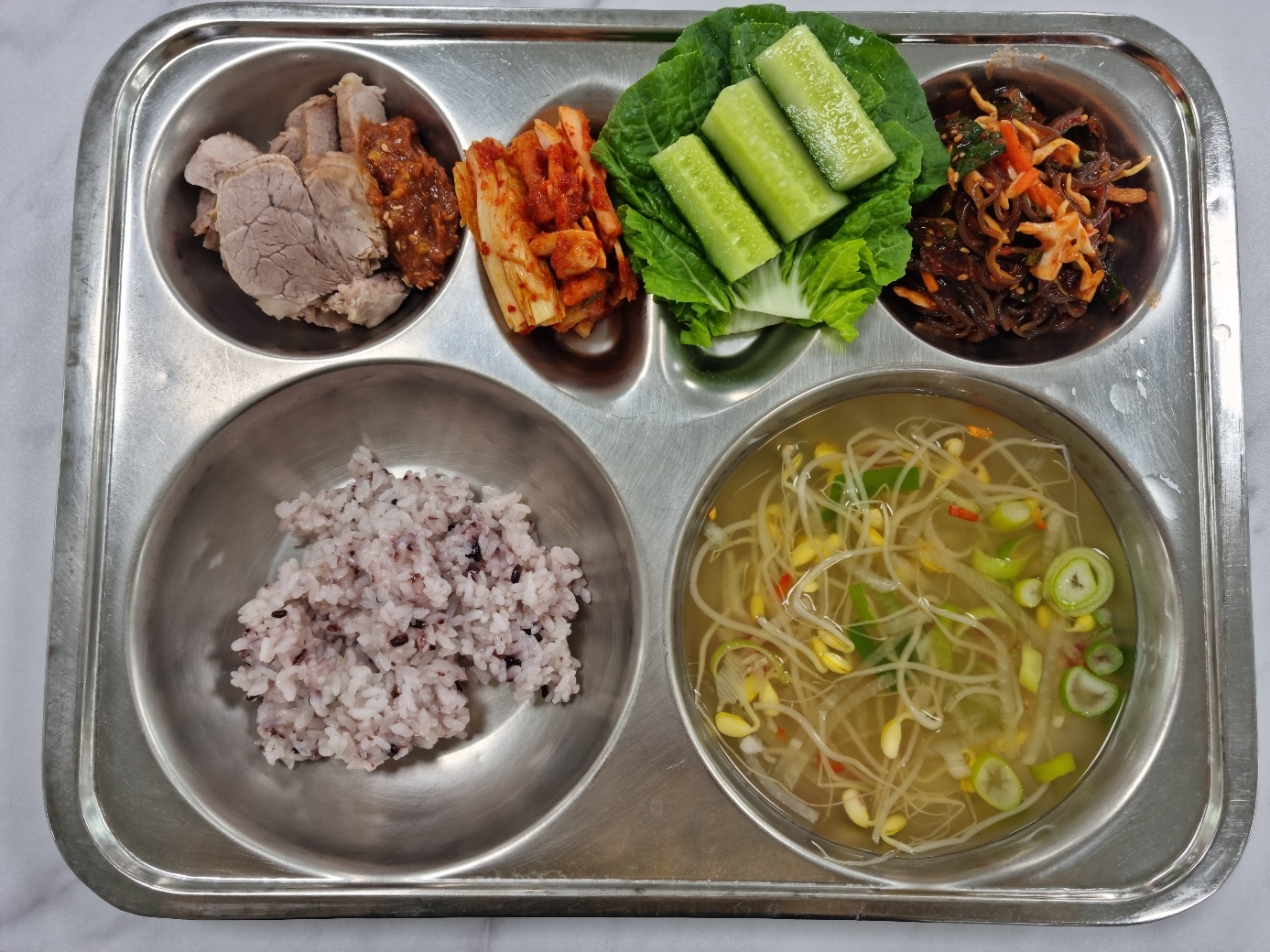 흑미밥(밀양) 콩나물국(밀양) (5.9)돼지고기수육(밀양) (5.6.10)비빔메밀막국수(밀양) (3.5.6.12.13)보쌈김치(밀양) (9)우유(우유급식) (2)쌈추쌈&오이스틱(밀양)(자율) (5.6.13)