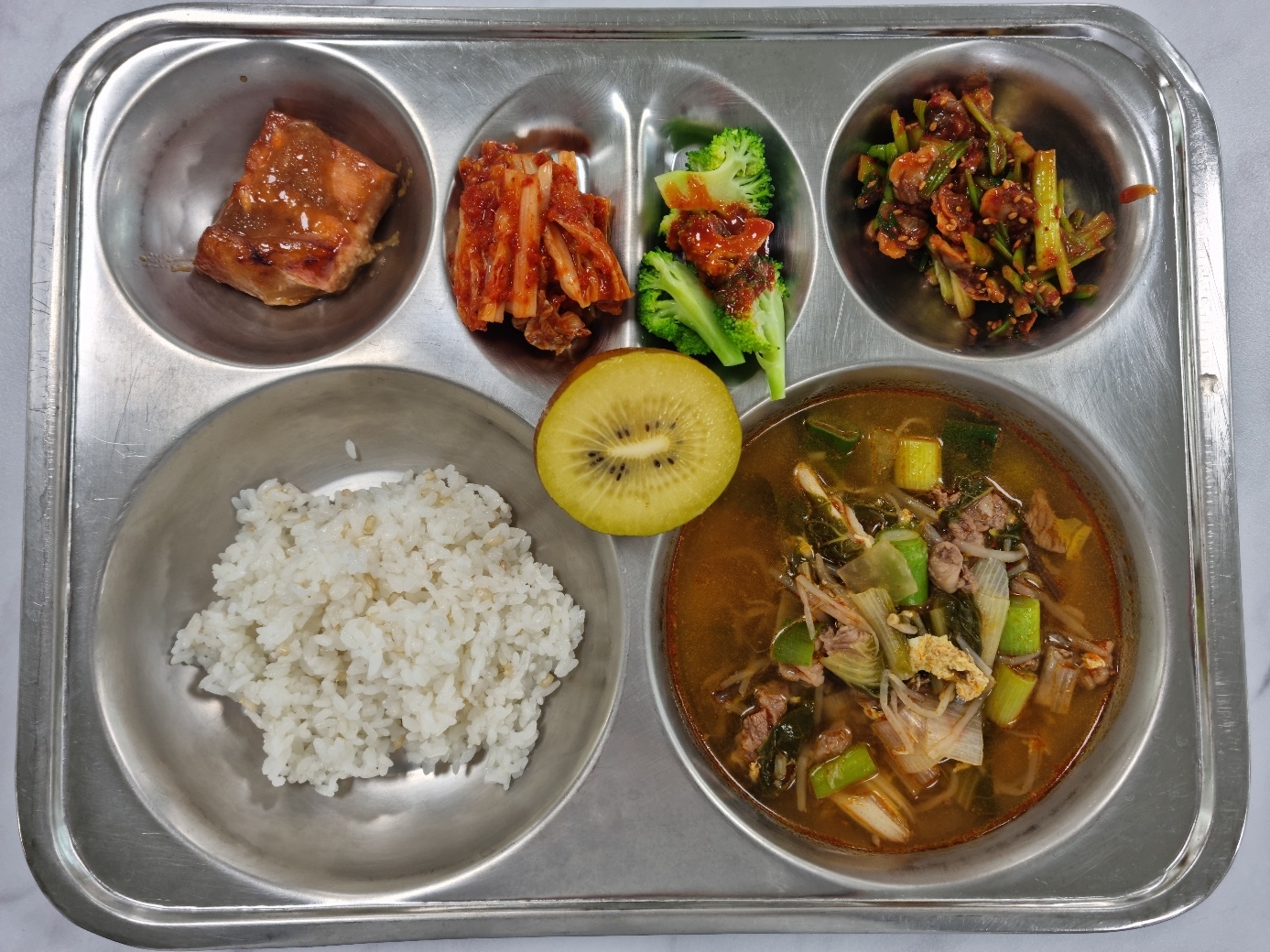 발아현미밥(밀양) 육개장(밀양) (1.5.6.16)미나리꼬막무침(밀양)(자율) (5.6.13.18)브로콜리&초고추장(밀양) (5.6.13)훈제연어구이/소스(밀양) 배추김치(밀양) (9)골드키위(밀양) 우유(우유급식) (2)