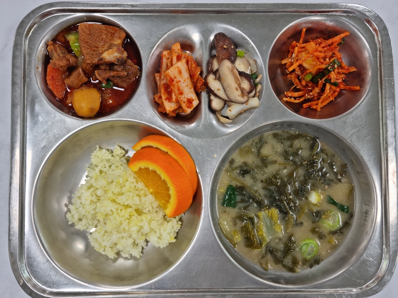 강황쌀밥(밀양) 쑥국(밀양) (5.6.18)매운돼지갈비찜(밀양) (5.6.10.13)진미도라지무침(밀양) (5.6.13.17)생표고버섯볶음(밀양)(자율) (5.6)배추김치(밀양) (9)오렌지(밀양) 우유(우유급식) (2)
